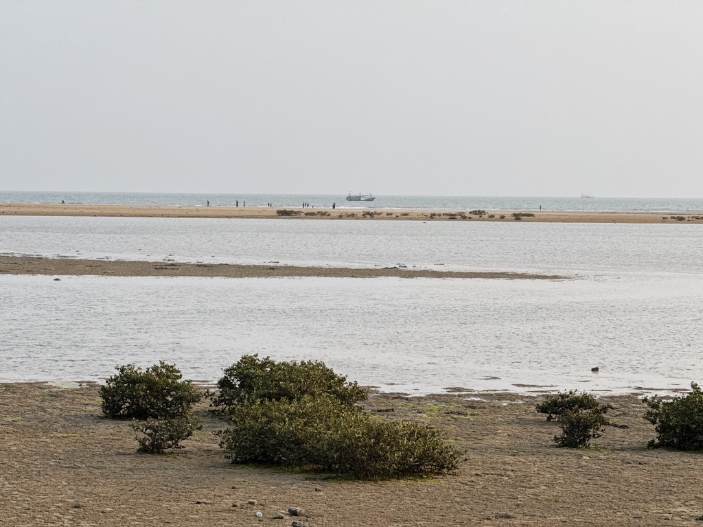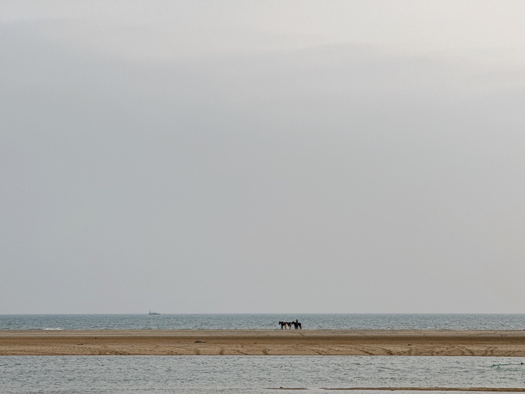 我们继续骑上电瓶车往西追落日,西边的沙滩相比东边的银滩要粗粝得多。沙滩上有很多的石头,沙子也不像东边的白沙滩那么细腻。这边的沙滩上则有人在聚众烧烤,远处的沙洲上甚至还有骑马拍照的,离开云南以后,这好像还是第一次看到骑马的。