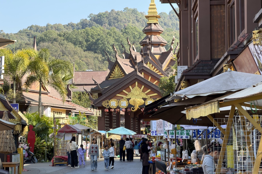 也得亏是来了傣族古镇,让我一百多个古镇的体验中,又体验了一最——最不古的古镇。这个古镇的建设者甚至都不试图掩饰一下这个古镇到底有多新。其实古也是个相对概念,如果我们站在 3045 年往前看,这个 2017 年建设起来的古镇确实有一千零二十八年的历史。它其实就是一个商业街项目,在诸多的商业街中没有那么聒噪,勉强可以一逛。