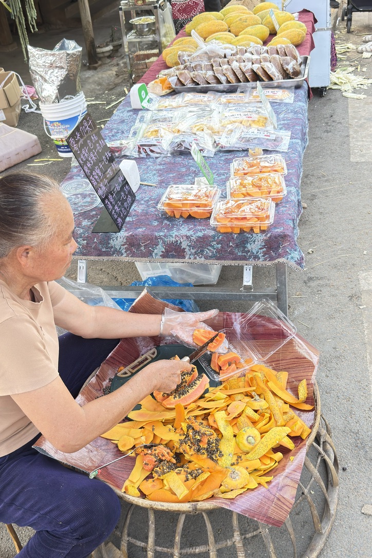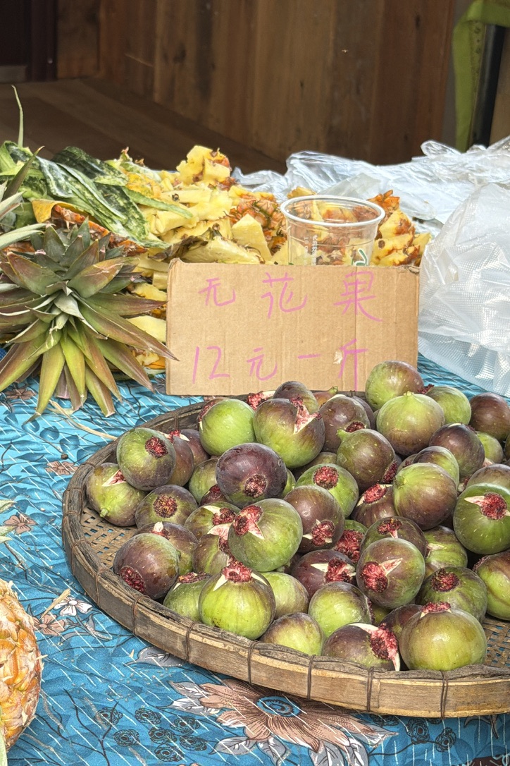 恙在这个村子里狂买水果,12 元一斤的无花果,5 元一个还给切好装盒的木瓜。