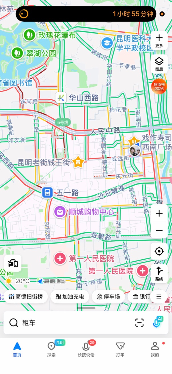 此时此刻的昆明,比此时此刻的杭州拥堵多了,从大后方发来的情报,杭州因为外地人都走了冷清的很,中河高架从南到北一脚油门过。但昆明可是春节旅游的热门目的地,到处都是人。