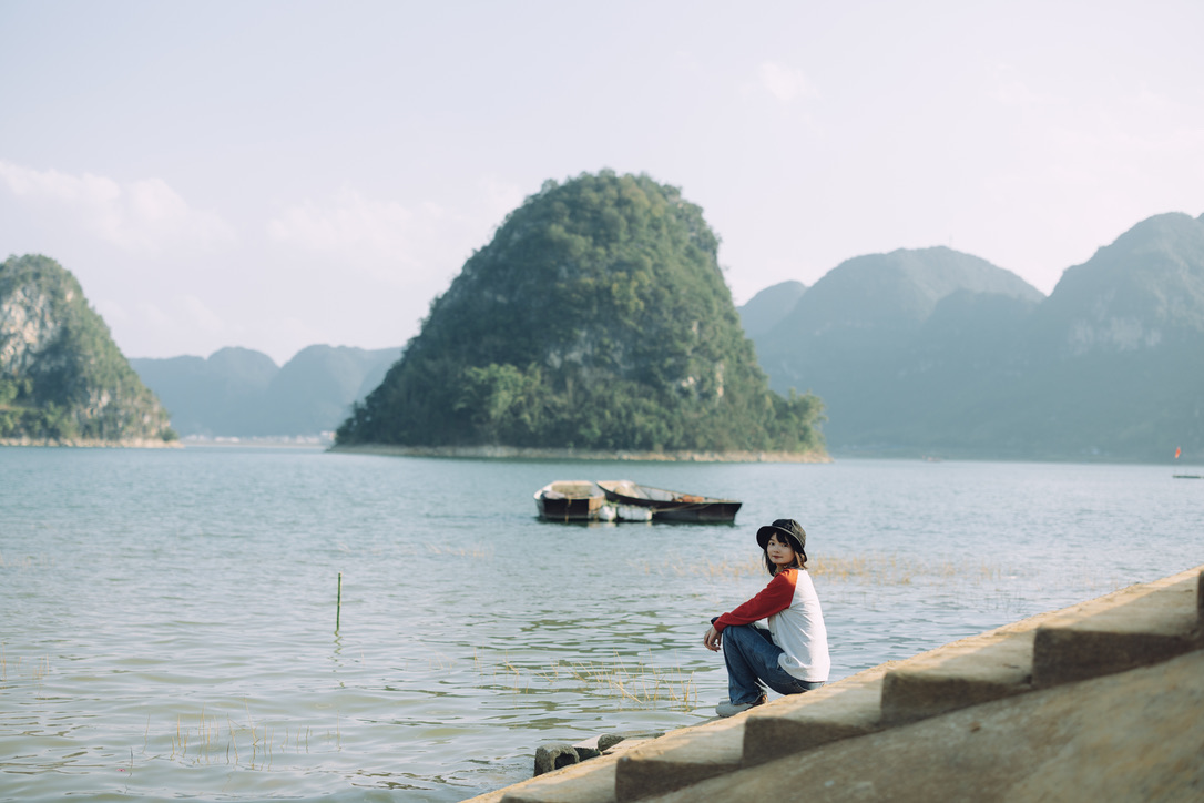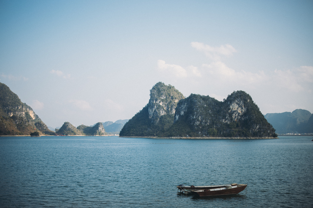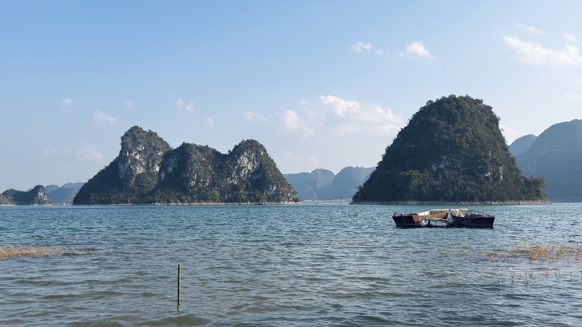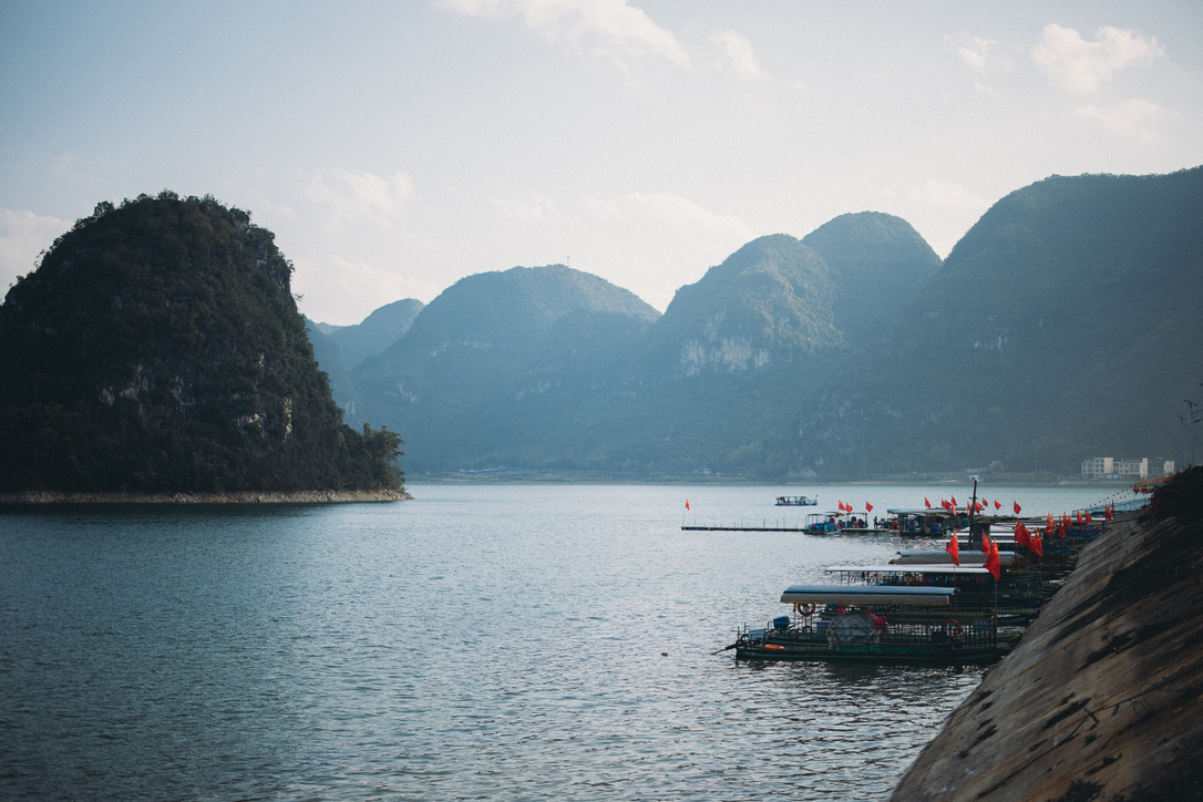 一见到渠洋湖还是很震撼的,这是我们第一次看到水上喀斯特地貌。一个个馒头包一样的小山峰,从水的平面上拔地而起,拔水而起。很多人选择了岜旗村的免费停车场作为露营的场地。虽然这里的环境很好,让我有那么一丢丢冲动想在这里露营,但是因为我们太久没有露营了,这里乱的一批,收拾起来不知道要有多麻烦。而我们已经过习惯了住酒店,频繁洗衣服的旅行方式。一毛一恙环中国的剩下旅行,就不要露营了吧。