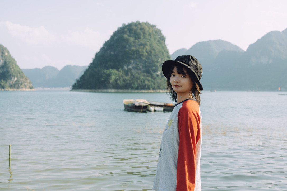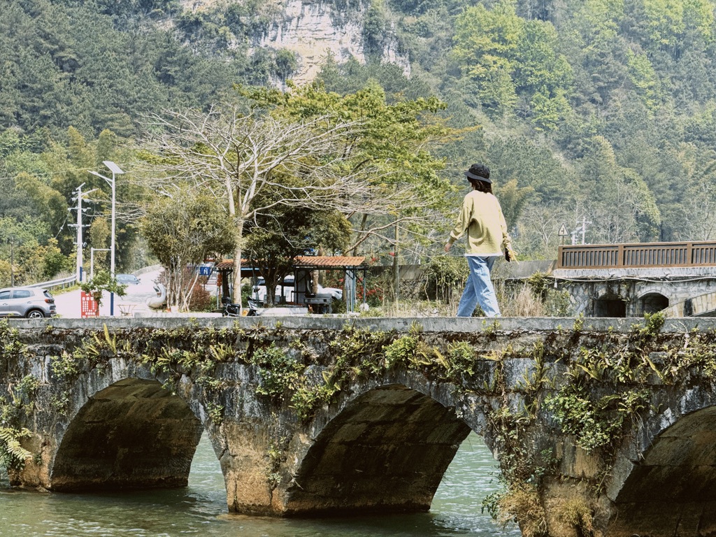 回程路上,我坐到船头,脚放到水里,冰凉爽快,看着周围的喀斯特山林,坐着小小竹排,忍不住唱起了《红星照我去战斗》。