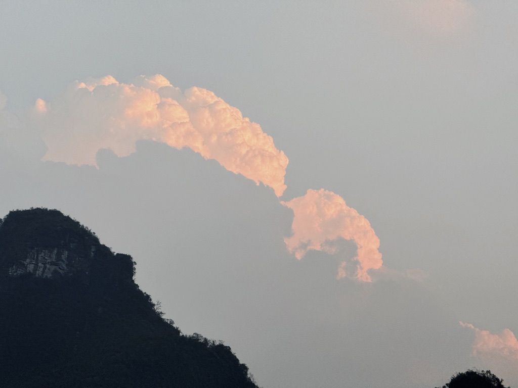 太阳已经下山了,东边的云披上一层浓烈的霞光,而已经被遮住光的云层则像隐身的山一样,遮挡着发光的云,肉眼看过去极其壮观,手机拍不出来。