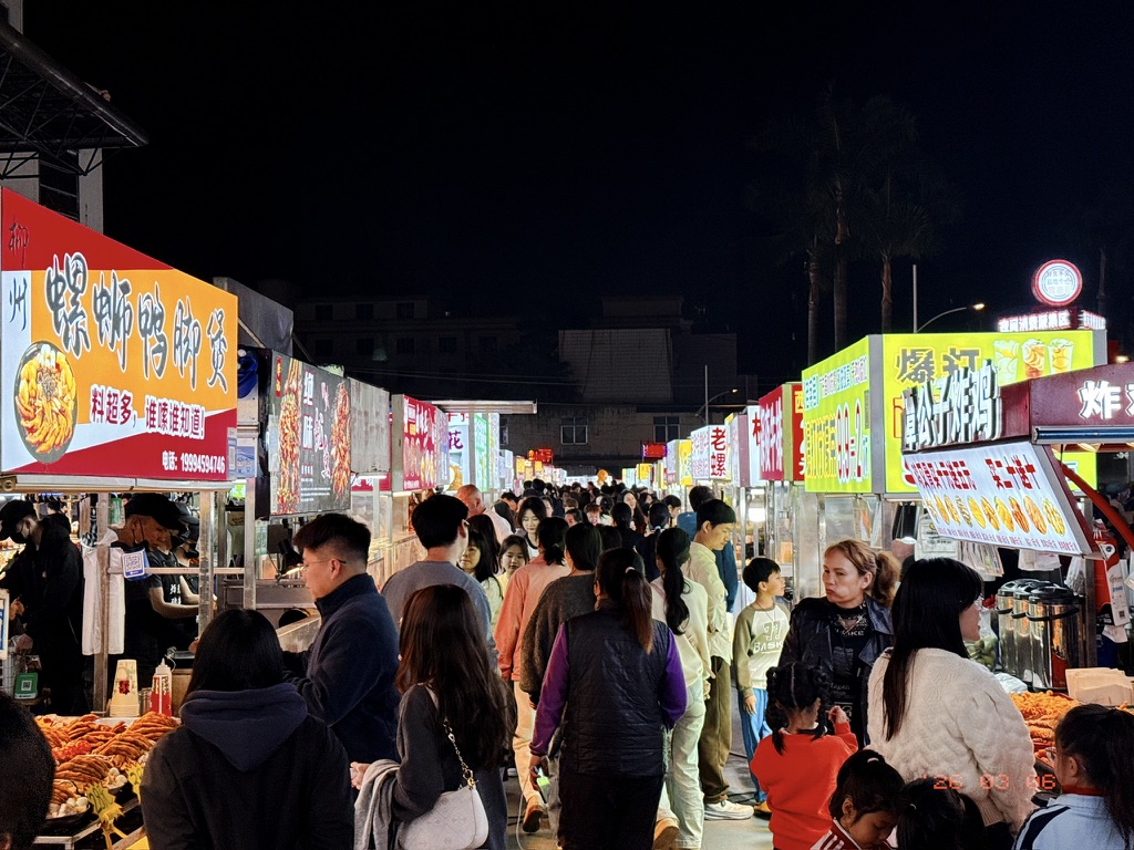 千不该万不该,不该在晚饭时间一人一大碗炒饭。8点钟的时候,我们去到钦州最大的海鲜小吃市场鸿发夜市。但此时此刻,我们两个没有一点肚子能吃下别的东西了。问君能有几多愁,恰似两个太监逛青楼。