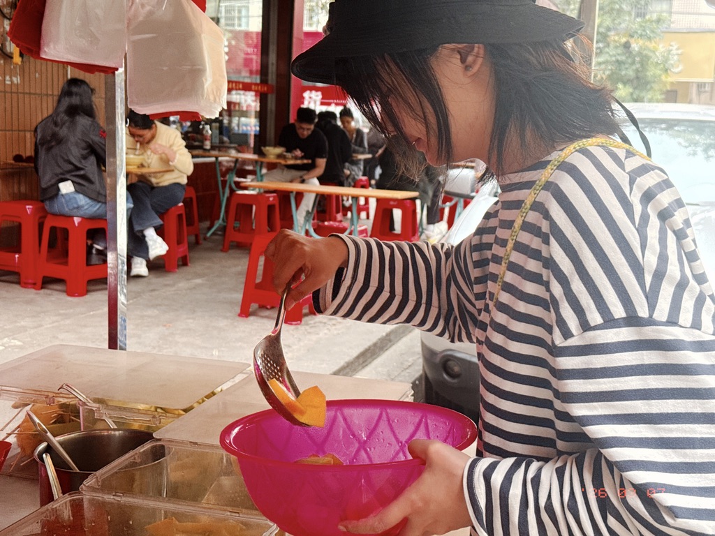 我们来到何记糖水铺,这家店据说一份糖水只要4块钱。我们一开始直奔舀糖水的那个阿姨,结果发现糖水加料的货柜在后面。气人的是,当时盆里的芒果已经全被舀光了,好不容易从里面捞出了一粒儿。等喝完糖水要走的时候,发现新的满满一盆芒果被补充进来。(恙最爱的水果就是芒果,我也爱,但我芒果过敏,吃完嘴唇会麻)