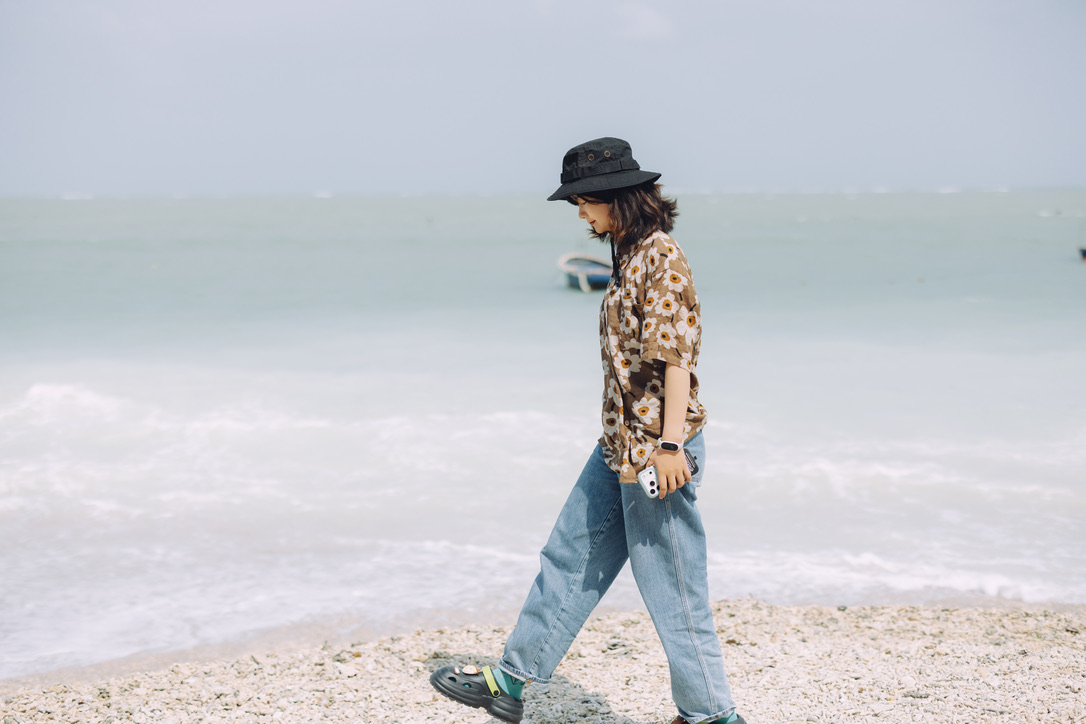 随后我们徒步走下山到海边,实际距离大概只有五百米吧,下坡的路有点窄,挤满了景交车,开车的司机还很不客气地呵斥徒步的游客让开别挡车的路。这些景交车看起来完全不像是官方运营的——何况这也不是个官方运营的景区,就是一个山洞而已。20 元单趟的景交车并不能直达燕子洞,因为海边是沙滩、礁石和海水,景交车能到的只有三百米左右,真有不少人被两公里的话术欺骗了,坐上了这 20 元 300 米的景交车。这再次刷新了我们遇到过的景交车价格纪录。