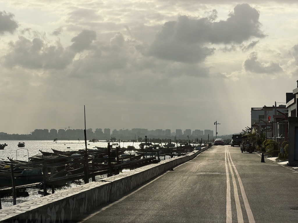 白天继续沿着旅游公路往南走,先穿过了神州半岛旅游度假区,这里可真是个度假区啊,是完完全全人工建造的一个旅游社区。我们的车子从北面的桥上开进去,西边的桥上开出来,停都没停。随后又是石梅湾,在停车场里停了一下下,恙儿说想去日月湾看人冲浪,于是我们直接上高速,开到了7公里之外的日月湾。