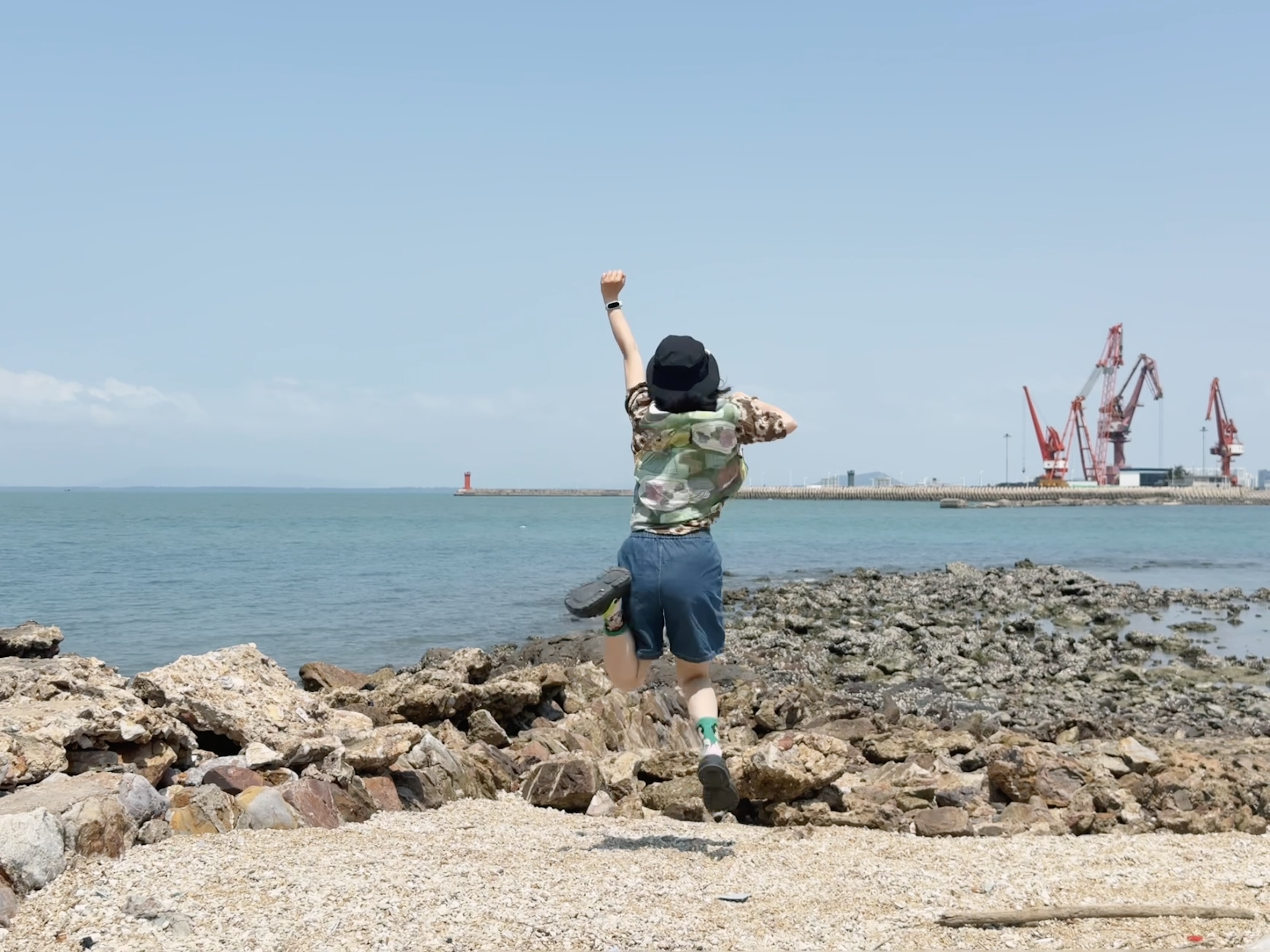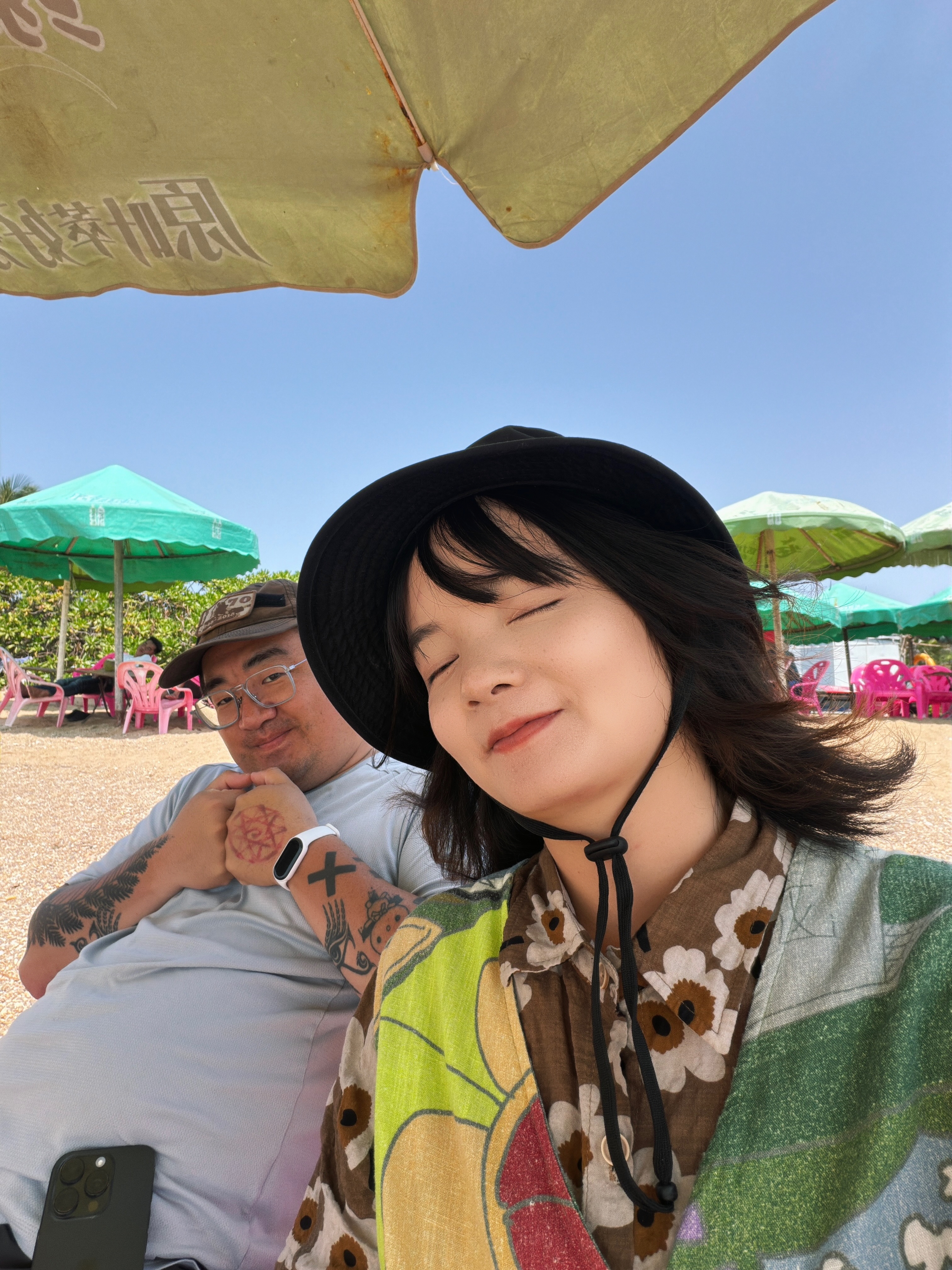 和所有的海南海边一样,鱼鳞洲的沙滩非常小,但依旧有人在卖椰子以及看海的座位。这里的价格非常便宜,于是我们也买了一个椰子,在这里看海。