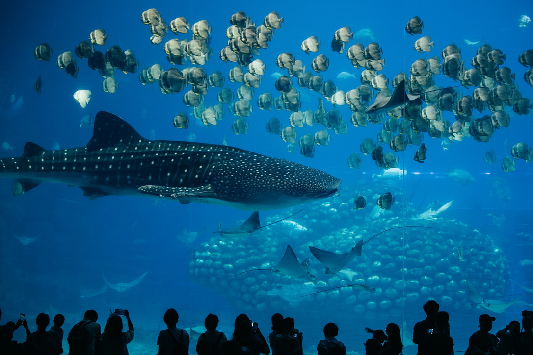 终于来到了鲸鲨馆的核心展厅,一面巨大的亚克力水族箱。而这里也是聚集人群最多的地方。进入这里后左转走坡道下去,要绕两绕才能下到地面。而二层最好的观赏位置,被划分给了商业摄影服务。