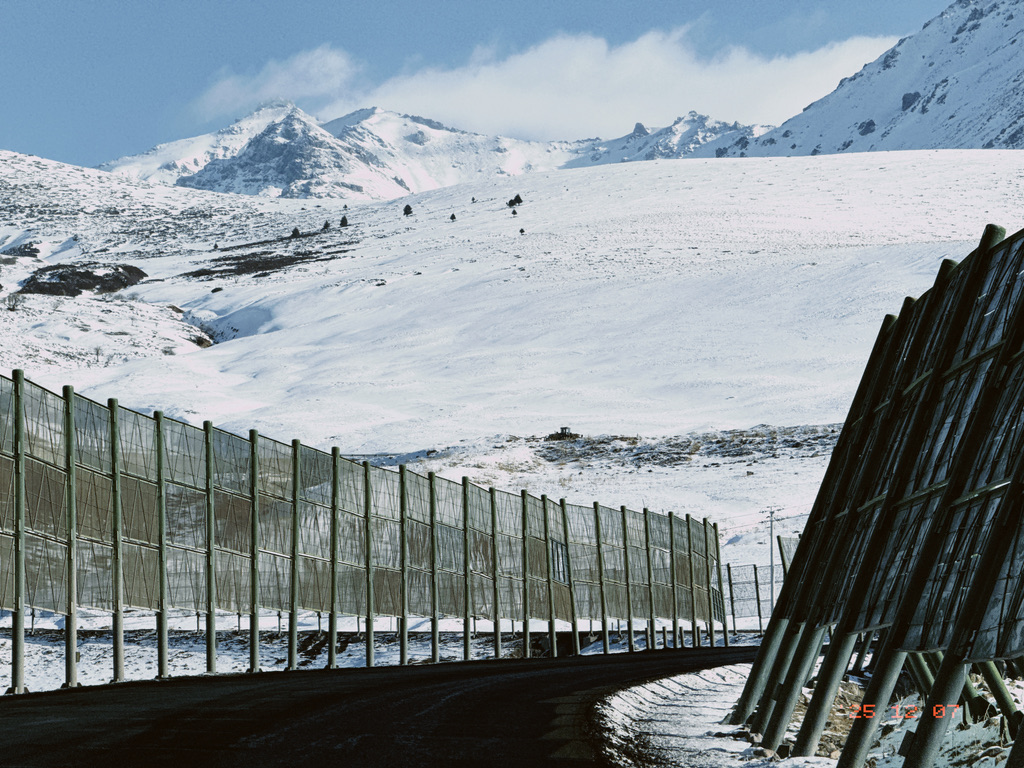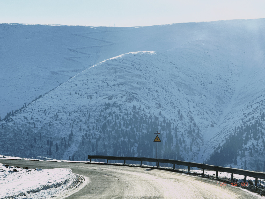 很快我们开始爬山,今天爬升的海拔有近两千米,最高达到 3300 多米。路况很好,路面没有积雪,想来这几天没有下雪,扫雪车一遍遍地作业,已经将公路修整得非常安全。